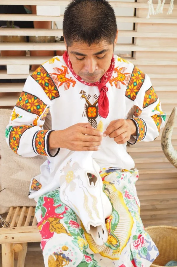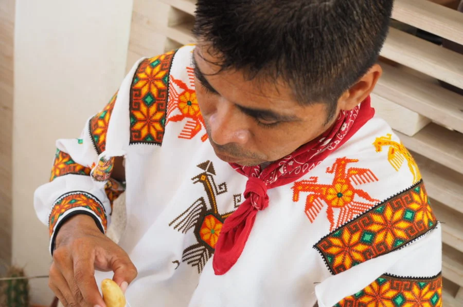 Las manos de Santos van soltando de a poco el hilo de algodón que acomoda con delicadeza sobre una superficie de cera para ir "coloreando" lo que a primera vista me parece un águila con una flor en el centro. Yo me acerco a platicar con él y mientras me cuenta de la técnica en que trabaja voy descubriendo que lo que dibuja con el hilo es una versión más detallada de un símbolo que tiene por todas partes en su traje huichol.